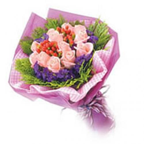 Hand Bouquet of 10 Stalks Pink Roses with Seasonal Mix Flowers