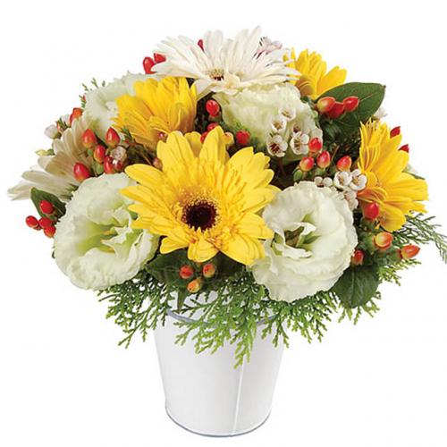 Table Arrangement of Yellow Gerberas, White Roses with Seasonal Mix Flowers.