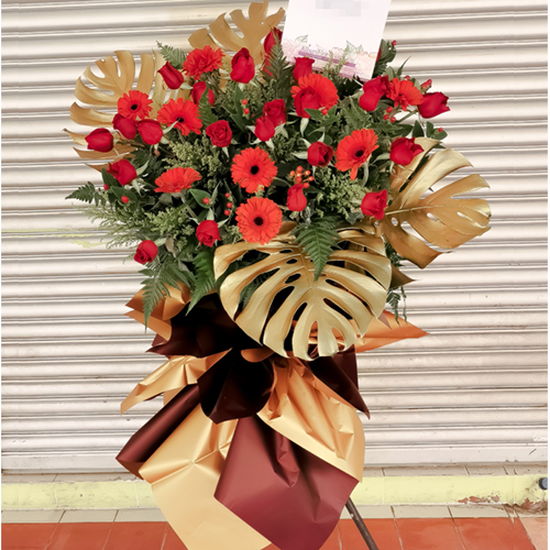 Grand Opening Flower Red Roses, Gerberas, Gold Leaf & Decorative Wrapper.