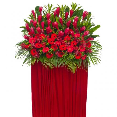 Red Roses,Red Gerberas,Ginzers,Mixed Fillers,Assorted Leaves and Decorated Flower Stand.