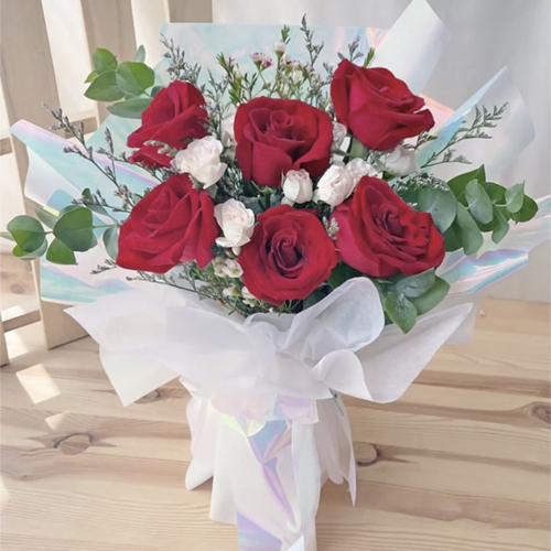 6 stalks Red Roses. Eucalyptus.