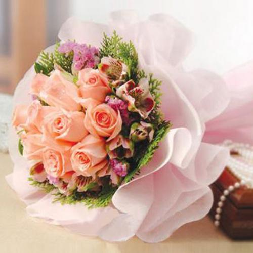 Sweet Bouquet of 12 Stalks Pink Roses with Seasonal Flowers.