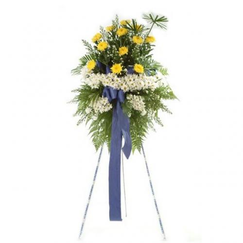 Yellow Chrysanthemum,Pompom,White Peacock,Assorted Leaves, Fancy Ribbon and Wood stand.