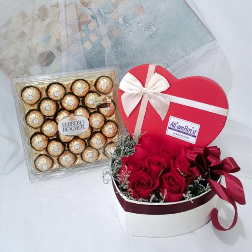9 Stalks Red Roses , Box with Ferrero Rocher.
